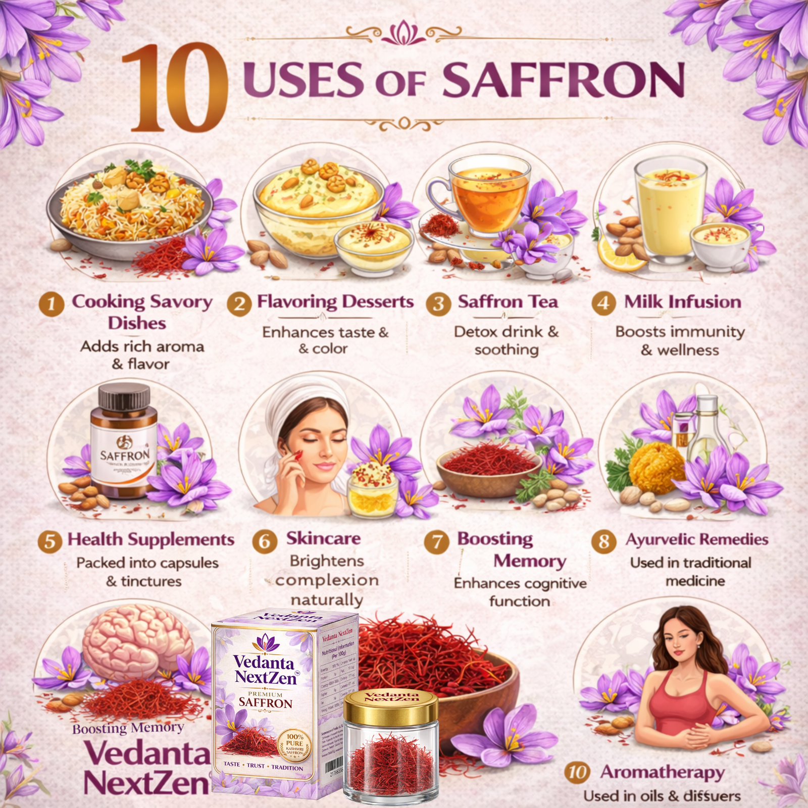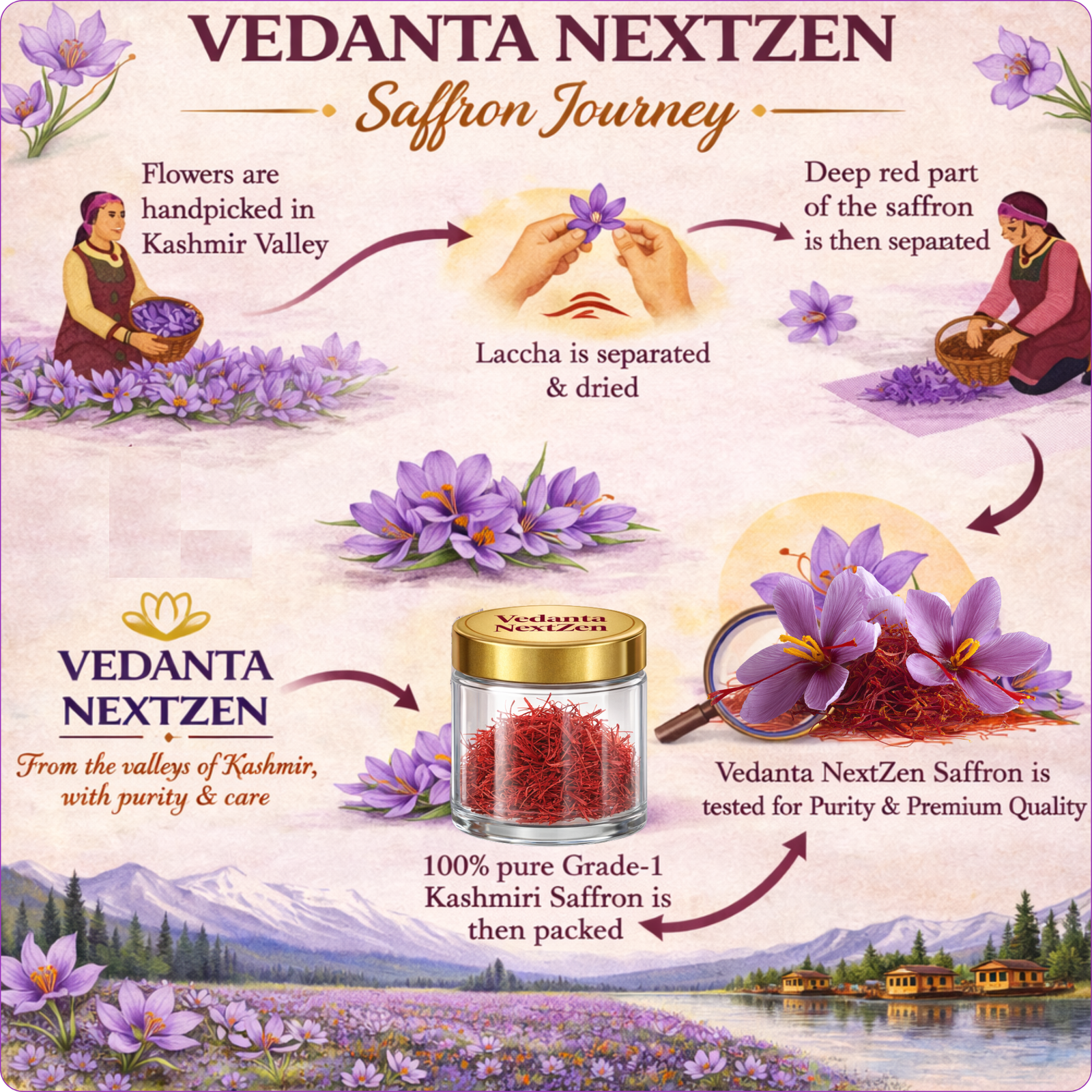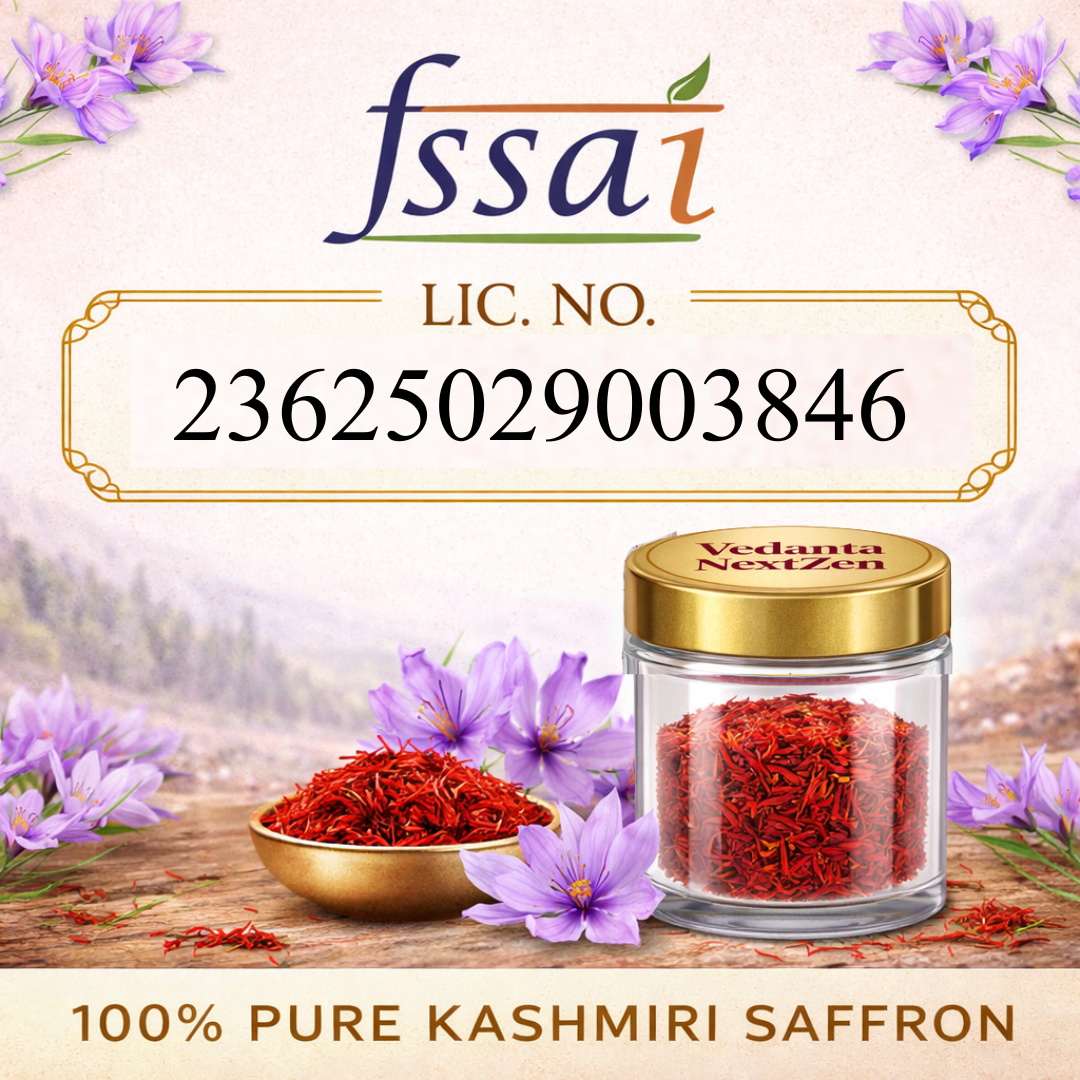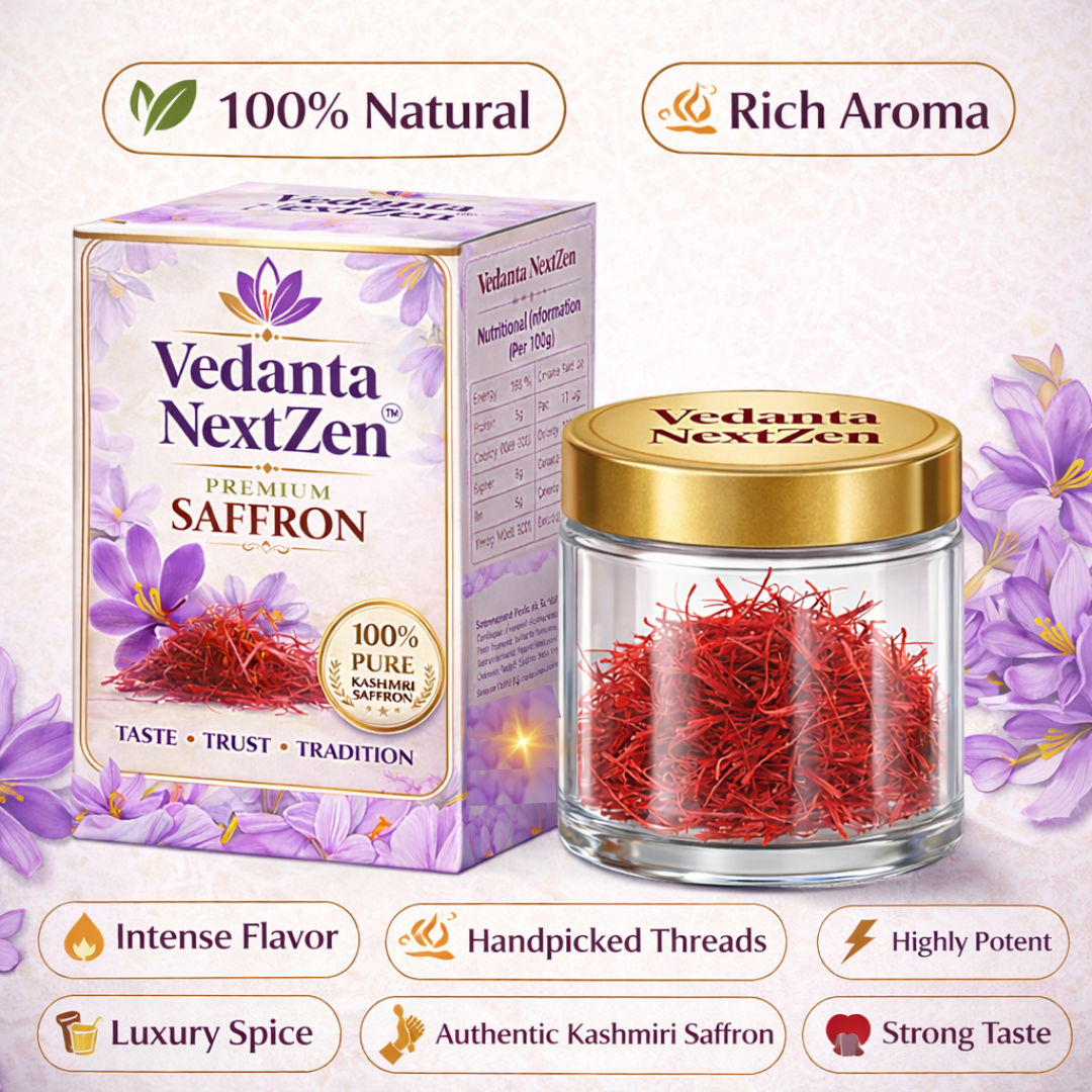 Discover the richness of Vedanta NextZen Kashmiri Saffron (Kesar) — sourced directly from the pristine valleys of Kashmir and carefully handpicked by experienced local farmers.